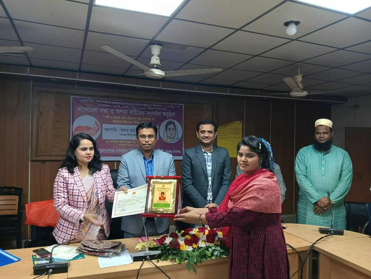 এদের মধ্যে সফল জননী মরিয়ম নেসা, নির্যাতনের বিভীষিকা মুছে ফেলে নতুন উদ্যমে জীবন শুরু করা নারী মোছা. আসমা বেগম, সমাজ উন্নয়নে অবদান রাখা নারী সাংবাদিক ও নারী উদ্যোক্তা ফারজানা আক্তার, অর্থনৈতিকভাবে সাফল্য অর্জনকারী নারী মহামায়া দাস এবং শিক্ষা ও চাকরির ক্ষেত্রে অবদান রাখা নারী চৈতী রাণী দাসকে সংবর্ধনা দিয়ে তাদে হাতে ক্রেস্ট, সনদ ও উপহার তুলে দেন অতিথিবৃন্দ।