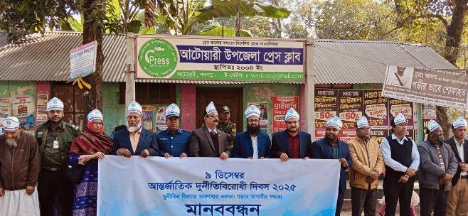 ভৌমিক আটোয়ারী(পঞ্চগড়) প্রতিনিধি।। “দুর্নীতি বিরুদ্ধে তারুণ্যের একতা, গড়বে আগামীর শুদ্ধতা ” এই শ্লোগানে পঞ্চগড়ের আটোয়ারীতে পালিত হয়েছে আন্তর্জাতিক দুনর্ীতি বিরোধী দিবস। দুর্নীতি দমন কমিশন (দুদক) সমন্বিত জেলা কার্যালয় ঠাকুরগাঁও এর উদ্যোগে এবং উপজেলা প্রশাসন ও উপজেলা দুনর্ীতি প্রতিরোধ কমিটির আয়োজনে মঙ্গলবার ( ৯ ডিসেম্বর) সকালে উপজেলা পরিষদ চত্বরে জাতীয় সঙ্গীত পরিবশেনের মধ্যদিয়ে জাতীয় পতাকা ও দুদক পতাকা আনুষ্ঠানিকভাবে উত্তোলন করা হয় এবং ফেস্টুনসহ বেলুন উড্ডয়নের মাধ্যমে দিবসটির আনুষ্ঠানিক শুভ উদ্বোধন ঘোষনা করেন সহকারী কমিশনার (ভূমি) (অ.দা.) মোঃ আশরাফুল ইসলাম। পরে আটোয়ারী উপজেলা প্রেসক্লাবের সামনে ঘন্টাব্যাপি দুর্নীতি বিরোধী মানববন্ধন অনুষ্ঠিত হয়। উপজেলা স্বাস্থ্য বিভাগ, প্রাথমিক শিক্ষা অফিস, মাধ্যমিক শিক্ষা অফিসসহ বিভিন্ন সরকারি দপ্তরগুলো দুনর্ীতি বিরোধী ব্যানার নিয়ে মানববন্ধন অনুষ্ঠানে যোগ দেন। মানববন্ধন শেষে উপজেলা পরিষদ সম্মেলন কক্ষে প্রতিপাদ্য বিষয়ের উপর গুরুত্বারোপ করে আলোচনা সভা অনুষ্ঠিত হয়। এতে সভাপতিত্ব করেন উপজেলা দুনর্ীতি প্রতিরোধ কমিটির সভাপতি মোঃ আব্দুল মান্নান। উপজেলা দুনর্ীতি প্রতিরোধ কমিটির সাধারণ সম্পাদক মোঃ ইউসুফ আলীর সঞ্চালনায় প্রধান অতিথির বক্তব্য রাখেন সহকারী কমিশনার(ভূমি)(অ.দা.) মোঃ আশরাফুল ইসলাম। বিশেষ অতিথির বক্তব্য রাখেন, উপজেলা স্বাস্থ্য ও প. প. কর্মকর্তা ডা. মোঃ হুমায়ুন কবীর, আটোয়ারী থানার ওসি (তদন্ত) মোঃ ফারুক হোসেন, উপজেলা প্রকৌশলী মোঃ ফয়সাল, দুনর্ীতি প্রতিরোধ কমিটির সাবেক সহ-সভাপতি বীর মুক্তিযোদ্ধা মোঃ জাহেদুর রহমান, কমিটির অন্যতম সদস্য মোছাঃ রুমি আক্তার চৌধুরী, উপজেলা প্রেসক্লাবের কোষাধ্যক্ষ মোঃ হাফিজুল ইসলাম প্রমুখ। সকল কর্মসূচিতে বিভিন্ন সরকারি দপ্তরের কর্মকর্তা-কর্মচারী, উপজেলা দুনর্ীতি প্রতিরোধ কমিটির সকল সদস্য, বিভিন্ন শিক্ষা দুর্নীতি শিক্ষক-শিক্ষাথর্ী,বিভিন্ন সামাজিক সংগঠনের নেতৃবৃন্দসহ গণমাধ্যমকর্মীগণ উপস্থিত ছিলেন।