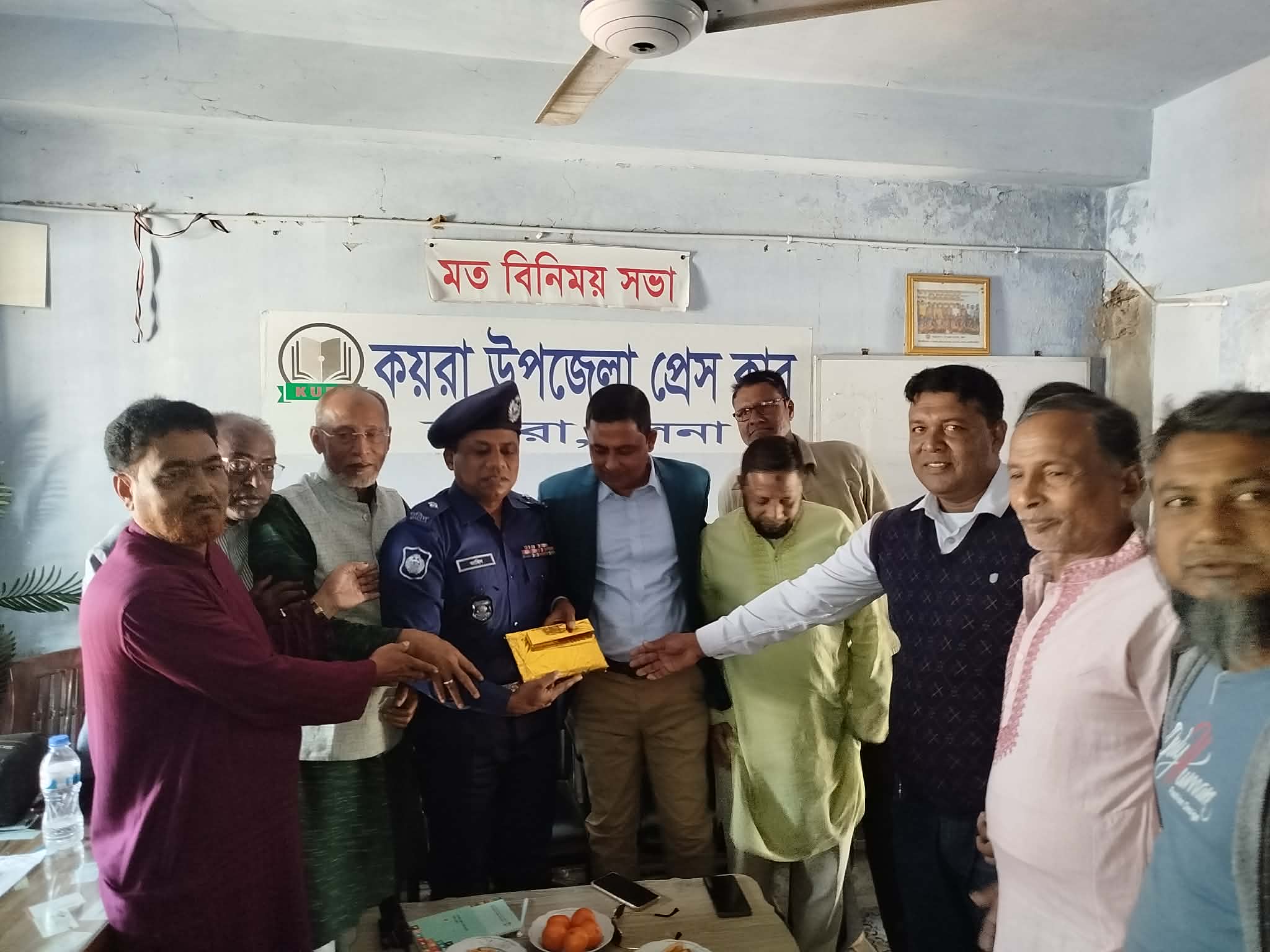 মতবিনিময় সভায় আরও বক্তব্য রাখেন কয়রার সিনিয়র সাংবাদিক মোস্তফা শফিকুল ইসলাম, মোহাঃ হুমায়ুন কবির, আঃ খালেক, প্রেসক্লাবের সহ-সভাপতি মাষ্টার আব্দুর রউফ, শেখ কওছার আলম, যুগ্ম সম্পাদক জিএম নজরুল ইসলাম, মোঃ গোলাম রব্বানী, কোষাধাক্ষ মোঃ ফরহাদ হোসেন, সাংগঠনিক সম্পাদক শাহিদুল ইসলাম, দপ্তর সম্পাদক অরবিন্দ কুমার মন্ডল, প্রচার সম্পাদক হাবিবুল্লাহ হাবিব, ক্রীড়া ও সাংস্কৃতিক সম্পাদক জিয়াউর রহমান ঝন্টু, ত্রান ও পুর্নবাসন সম্পাদক শেখ জাহাঙ্গীর কবির টুলু, সাংবাদিক নুরুল আমিন নাহিন, গীরেন্দ্রনাথ মন্ডল, মজিবার রহমান, প্রভাষক রবিউল ইসলাম, আবুল বাশার, আবু ওবায়দা, মোঃ ফারুক আজম, আরিফুর রহমান, ফয়সাল হোসেন প্রমুুখ। মতবিনিময় সভায় কয়রার আইনশৃঙ্খলা ভাল রাখতে বিভিন্ন বিষয় নিয়ে গুরত্বপুর্ন আলোচনা অনুষ্ঠিত হয়। এ সময় নবাগত অফিসার ইনচার্জ মোঃ জাহিদুল ইসলাম কয়রার আইনশৃঙ্খলা ভাল রাখতে সাংবাদিকদের সার্বিক সহযোগিতা কামনা করেন।