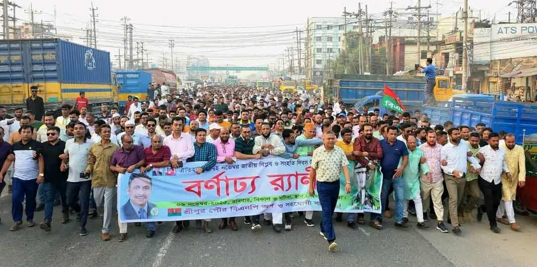 গাজীপুরের শ্রীপুরে জাতীয় বিপ্লব ও সংহতি দিবস উপলক্ষে বর্ণাঢ্য র্যালি করছে শ্রীপুর পৌর বিএনপি।