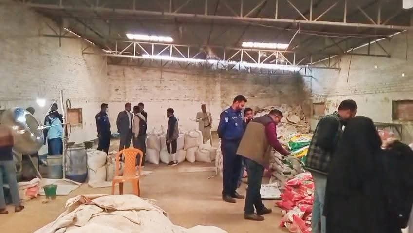 গোটা মুসুর ১ টন এবং ইটের খোয়া দিয়ে তৈরি নিষিদ্ধ বাসুডিন - ৩ কেজি সহ ভেজাল সার তৈরির কাচামাল ও মেশিন জব্দ করা হয়।