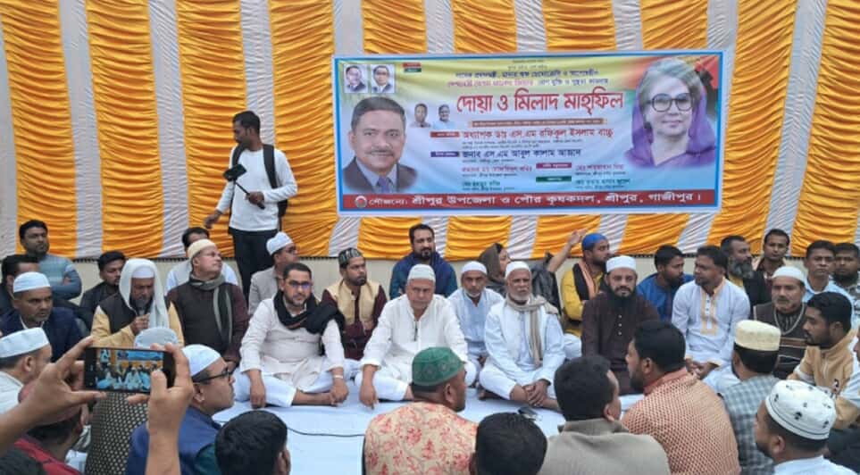 বিএনপির চেয়ারপারসন ও তিন বারের সাবেক প্রধানমন্ত্রী দেশনেত্রী বেগম খালেদা জিয়ার রোগমুক্তি ও সুস্থতা কামনায় শ্রীপুরে দোয়া ও মিলাদ মাহফিল অনুষ্ঠিত হয়েছে।