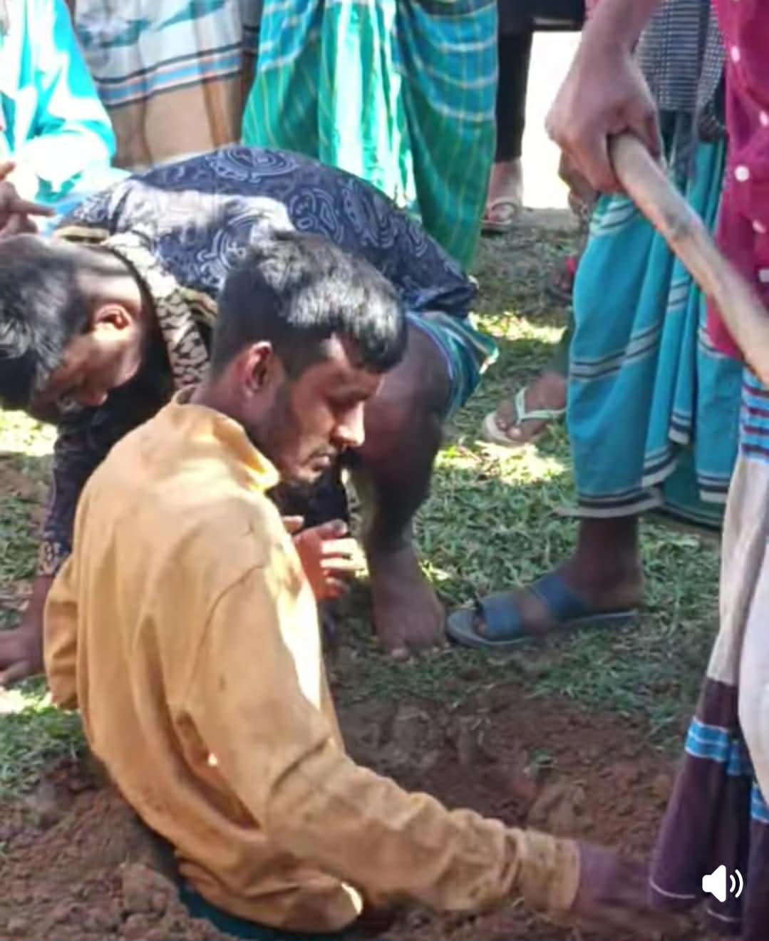 অভিযোগ রয়েছে, পরে কিছু প্রতিবেশী তাকে ধরে মারধর করে এবং একপর্যায়ে জীবিত অবস্থায়ই কোমর পর্যন্ত মাটিচাপা দেয়। পরে খবর পেয়ে পুলিশ ঘটনাস্থলে পৌঁছে তাকে উদ্ধার করে।