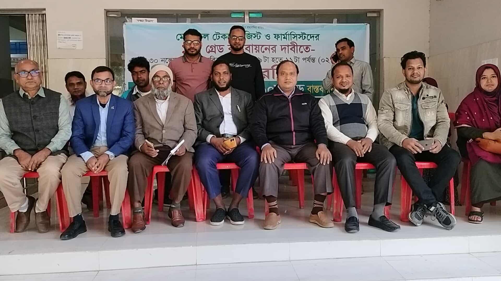 কর্মবিরতিতে অংশ নেন মেডিকেল টেকনোলজিস্ট আরিফ হোসেন, সুশান্ত কুমার দাস, ফার্মাসিস্ট উজ্জ্বল আলী, মনসুর আলী, একরামুল হক, কামরুজ্জামান এবং ল্যাব টেকনোলজিস্ট শাহীনা আক্তারসহ আরও অনেকে।