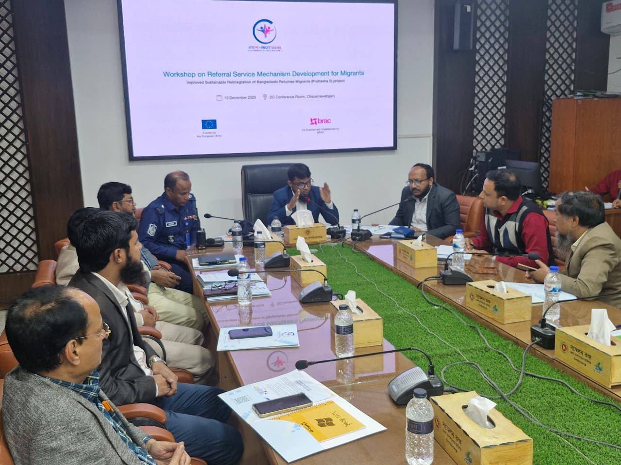 জেলা পর্যায়ে বিদেশ ফেরত অভিবাসীদের জন্য কার্যকর রেফারেল সার্ভিস বিষয়ক কর্মশালা অনুষ্ঠিত হয়েছে চাঁপাইনবাবগঞ্জে। বুধবার দুপুরে জেলা প্রশাসকের কার্যালয়ের সম্মেলন কক্ষে ব্র্যাকের ইমপ্রুভমেন্ট সাসটেইনেবল রিইন্টিগ্রেশন অব বাংলাদেশী রিটার্ন মাইগ্রেন্টস, প্রত্যাশা-০২ প্রকল্পের আওতায় এই কর্মশালা অনুষ্ঠিত হয়।