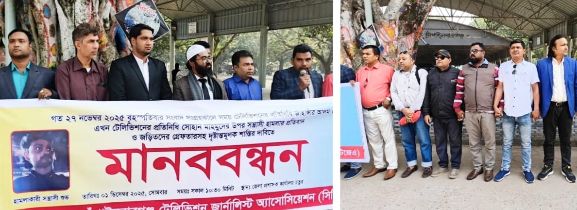 চাঁপাইনবাবগঞ্জে সংবাদ সংগ্রহকালে সময় টেলিভিশনের প্রতিনিধি জাহাঙ্গীর আলম ও এখন টেলিভিশনের প্রতিনিধি সোহান মাহমুদের উপর হামলা ও সন্ত্রাসীদের দৃষ্টান্তমূলক শাস্তির দাবীতে মানববন্ধন করেছে চাঁপাইনবাবগঞ্জ টেলিভিশন।