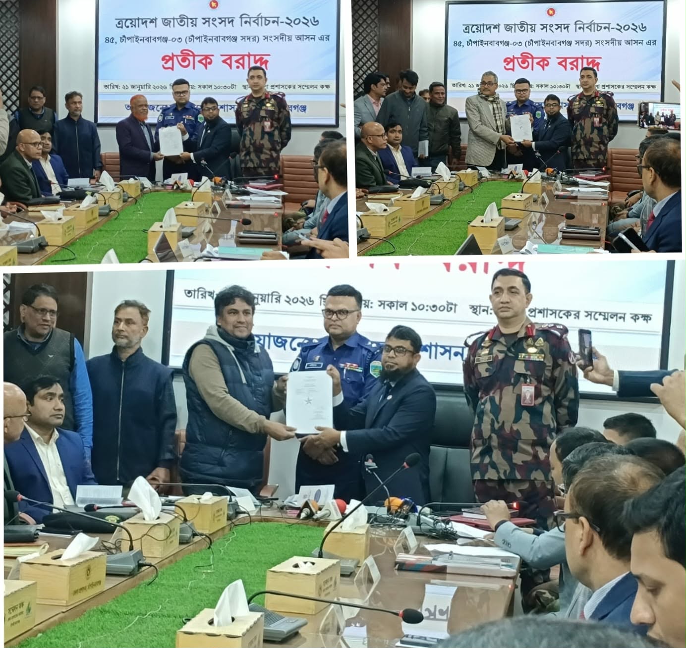 আসন্ন ত্রয়োদশ জাতীয় সংসদ নির্বাচনে চাঁপাইনবাবগঞ্জের ৩টি সংসদীয় আসনে ১৬ প্রার্থীর মধ্যে প্রতীক বরাদ্দ করা হয়েছে। বুধবার সকাল সাড়ে ১০ টায় জেলা প্রশাসকের সম্মেলন কক্ষে নির্বাচনের জেলা রিটার্নিং কর্মকর্তা ও জেলা প্রশাসক মোঃ শাহাদাত হোসেন মাসুদ প্রার্থী ও প্রার্থীর প্রতিনিধিদের মাঝে প্রতীক বরাদ্দ দেওয়া হয়। চাঁপাইনবাবগঞ্জ-১ আসনে জামায়াতে ইসলামীর ড. কেরামত আলীকে (দাঁড়িপাল্লা), বিএনপি প্রার্থী অধ্যাপক শাহজাহান মিঞাকে (ধানের শীষ), জাতীয় পার্টির আফজাল হোসেনকে (লাঙ্গল), বাংলাদেশ সাংস্কৃতিক মুক্তিজোটের মোঃ আব্দুল হালিমকে (ছড়ি), বাংলাদেশ ইসলামী ফ্রন্টের নবাব মোঃ শামসুল হোদকে মোমবাতি ইসলামী আন্দোলন বাংলাদেশের মোঃ মনিরুল ইসলামকে (হাতপাখা) ও চাঁপাইনবাবগঞ্জ-২ আসনে (গোমস্তাপুর, নাচোল ও ভোলাহাট) জামায়াতে ইসলামীর ড. মিজানুর রহমানকে দাঁড়িপাল্লা, বিএনপির মোঃ আমিনুল ইসলামকে ধানের শীষ, জাতীয় পার্টির মু. খুরশিদ আলমকে লাঙ্গল, বাংলাদেশ কমিউনিস্ট পার্টির মোঃ সাদেকুল ইসলামকে (কাস্তে), ইসলামী আন্দোলন বাংলাদেশের মোঃ ইব্রাহিম খলিলকে (হাতপাখা) এবং চাঁপাইবাবগঞ্জ-৩ আসনে জামায়াতে ইসলামীর মোঃ নূরুল ইসলাম বুলবুলকে দাঁড়িপাল্লা, বিএনপি’র মোঃ হারুনুর রশীদকে ধানের শীষ, জেএসডি’র মোঃ ফজলুর ইসলাম খাঁন সুমনকে তারা, গণ অধিকার পরিষদের মোঃ শফিকুল ইসলামকে ট্রাক ও ইসলামী আন্দোলনের মোঃ মনিরুল ইসলামকে (হাতপাখা) বরাদ্দ দেওয়া হয়েছে। প্রতীক বরাদ্দ অনুষ্ঠানে নির্বাচনের রিটার্নিং কর্মকর্তা ও জেলা প্রশাসক প্রার্থীদের নির্বাচনী আচরণবিধি মেনে প্রচার চালানোর জন্য আহবান জানান। এর যেন কোন ধরনের ব্যতয় না ঘটে। শান্তিপূর্ণ পরিবেশে নির্বাচন শেষ করার জন্য তিনি প্রার্থীদের সহযোগিতা কামনা করেন।