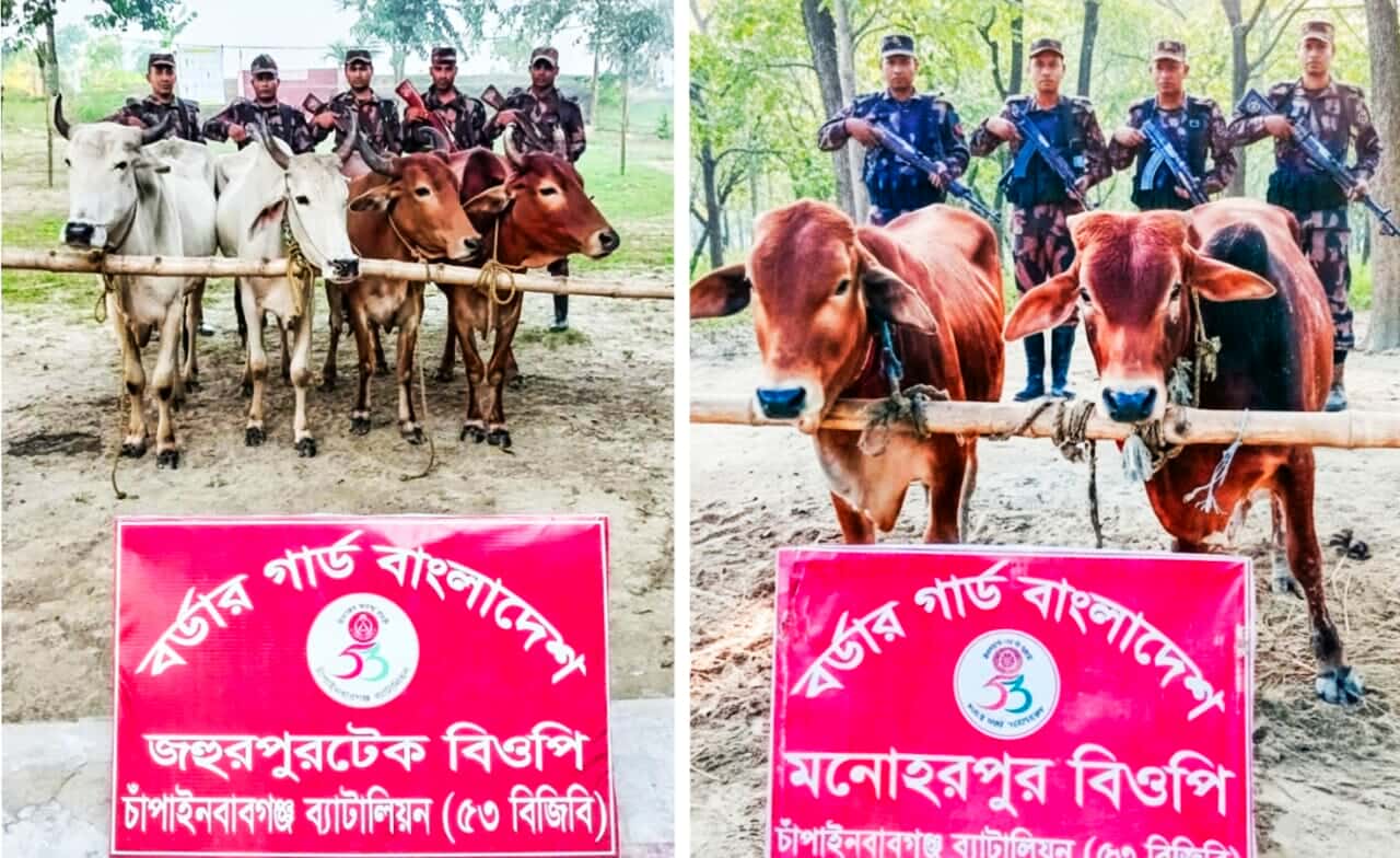 চাঁপাইনবাবগঞ্জ ব্যাটালিয়ান (৫৩ বিজিবি) কর্তৃক পৃথক পৃথক অভিযানে ৮ টি ভারতীয় গরু আটক করেছে। বিজিবি গোপন সূত্রের ভিত্তিতে জানতে পারে যে, চোরাকারবারীরা চোরাচালানের উদ্দেশ্যে ভারত হতে গবাদিপশু নদীতে ভাসিয়ে বাংলাদেশ আনে এবং গবাদিপশু গুলো অন্য স্থানে লুকিয়ে রেখেছে। এপ্রেক্ষিতে(২০ নভেম্বর) আনুমানিক ভোর ৪ঃ৩০ মিনিটের সময়। অত্র ব্যাটালিয়নের অধীনস্থ মনোহরপুর, জহুরপুর ও জহুরপুরটেক বিওপির বিশেষ টহলদল পৃথক পৃথক অভিযান পরিচালনা করে চাঁপাইনবাবগঞ্জ জেলার সদর ও শিবগঞ্জ থানাধীন সূর্যনারায়নপুর ও দুর্লভপুর ইউনিয়নের বিভিন্ন এলাকা হতে ০৮টি ভারতীয় গরু জব্দ করে। জব্দকৃত গরু চাঁপাইনবাবগঞ্জ শুল্ক কার্যালয় জমা করা হয়েছে।