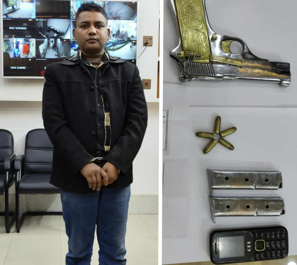 চাঁপাইনবাবগঞ্জে আমেরিকার তৈরি পিস্তল ও গুলিসহ রয়েল হাসান অরণ্য (৩৫) নামে এক যুবককে আটক করেছে পুলিশ। গতকাল ১ ডিসেম্বর সোমবার বিকাল সাড়ে চার ঘটিকায় চাঁপাইনবাবগঞ্জ পৌরসভার রেহাইচর এলাকার মহানন্দা সেতুর টোলপ্লাজায় তাকে আটক করা হয়। চাঁপাইনবাবগঞ্জের অতিরিক্ত পুলিশ সুপার এনএম ওয়াসিম ফিরোজ এ তথ্য নিশ্চিত করেছেন। রয়েল হাসান অরণ্য শিবগঞ্জের মনাকষা ইউনিয়নের পারচোকা মাদ্রাসা বাজারের মৃত আল মামুনের ছেলে। অতিরিক্ত পুলিশ সুপার এনএম ওয়াসিম ফিরোজ বলেন, গোপন তথ্যের ভিত্তিতে টোলপ্লাজায় চেকপোস্ট বসিয়ে যানবাহনে তল্লাশী চালায় পুলিশের একটি দল। এ সময় সিএনজি চালিত একটি অটোরিকশা থেকে একটি পিস্তল, ৫ রাউন্ড গুলি ও দুটি ম্যাগজিনসহ রয়েল হাসান অরণ্যকে আটক করা হয়। অরণ্য শিবগঞ্জ থেকে চাঁপাইনবাবগঞ্জ শহর আসছিলেন।