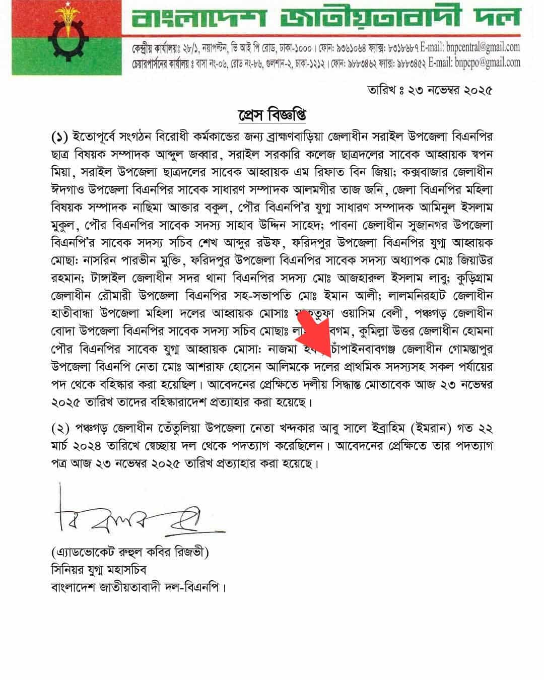 রবিবার (২৩ নভেম্বর ২০২৫) বিএনপির সিনিয়র যুগ্ম মহাসচিব অ্যাডভোকেট রুহুল কবির রিজভী স্বাক্ষরিত এক প্রেস বিজ্ঞপ্তিতে তাঁর বহিষ্কারাদেশ প্রত্যাহারের বিষয়টি নিশ্চিত করা হয়।