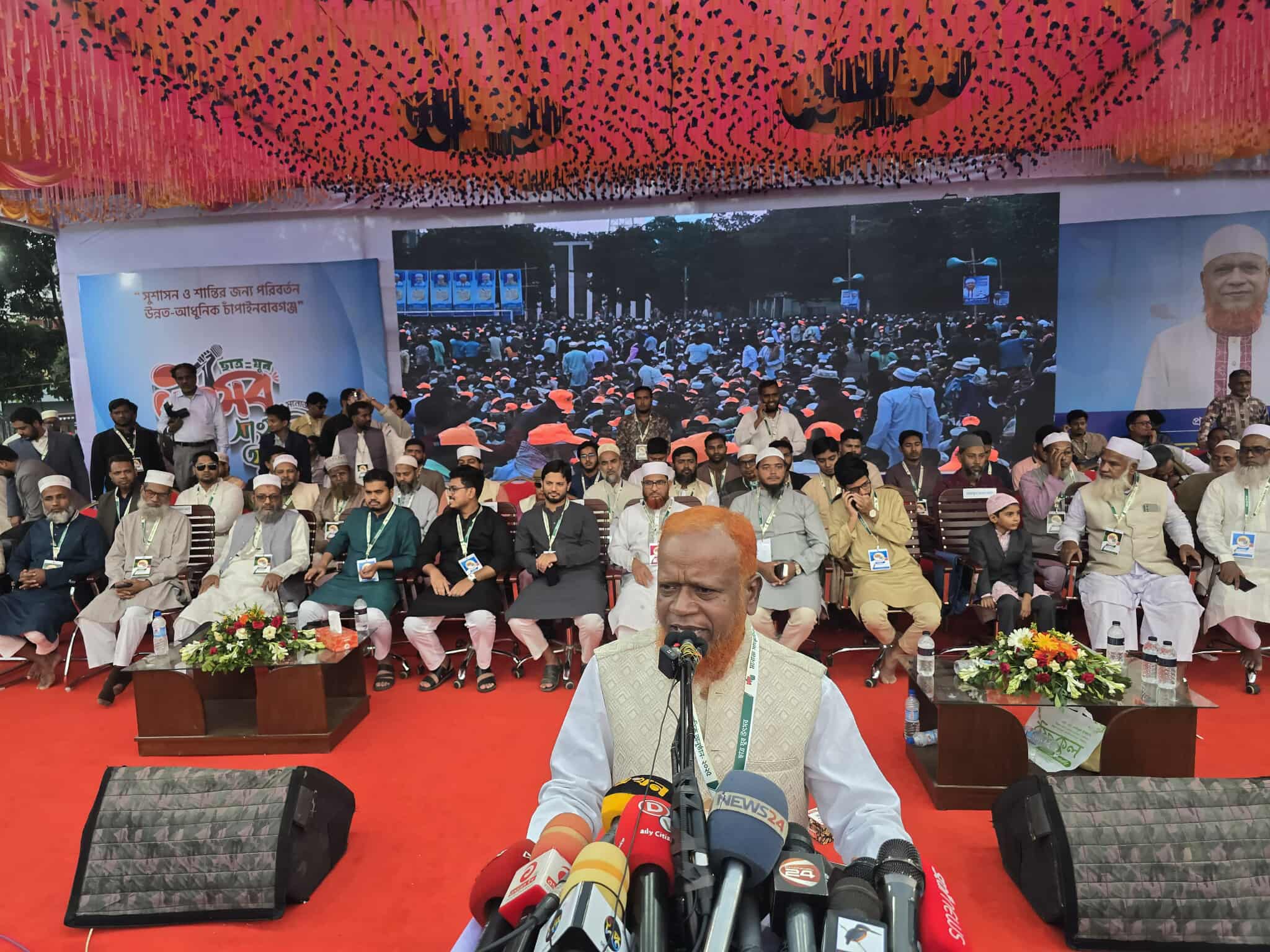 চাঁপাইনবাবগঞ্জ স্বনামধন্য কলেজ নবাবগঞ্জ সরকারি কলেজ মাঠ প্রাঙ্গণে (২২ নভেম্বর) শনিবার দুপুর ৩ ঘটিকায় জামায়াতে ইসলামীর ছাত্র - যুবকদের নিয়ে বিশাল সমাবেশ ও সাংস্কৃতিক অনুষ্ঠানের আয়োজন করেছে। ‘সুশাসন ও শান্তির জন্য পরিবর্তন, উন্নত আধুনিক চাঁপাইনবাবগঞ্জ’ স্লোগানে-এ সমাবেশে এক লাখের বেশি মানুষের উপস্থিতি নিশ্চিত করেছে দলটি। জামায়াত নেতাদের ভাষ্য অনুযায়ী চাঁপাইনবাবগঞ্জের ইতিহাসে এরকম নজিরবিহীন সমাবেশ আয়োজন কেউ করতে পারিনি। উক্ত সমাবেশে সভাপতিত্ব করেন জামায়াতে ইসলামীর জেলা সেক্রেটারি অধ্যাপক আবু বক্কর। প্রধান অতিথি হিসেবে উপস্থিত ছিলেন জামায়াতে ইসালামীর কেন্দ্রীয় কর্মপরিষদ সদস্য, ঢাকা মহানগরী দক্ষিণের আমীর ও নবাবগঞ্জ সরকারি কলেজে সাবেক ভিপি চাঁপাইনবাবগঞ্জ -৩ আসনে জামায়াতে মনোনীত প্রার্থী নুরুল ইসলাম বুলবুল। বিশেষ অতিথি বক্তব্য দেন, ইসলামী ছাত্রশিবিরের কেন্দ্রীয় সভাপতি জাহিদুল ইসলাম, জামায়াতে ইসলামীর কেন্দ্রীয় কর্মপরিষদ সদস্য ও ঢাকা মহানগরী দক্ষিণের সেক্রেটারি ড. শফিকুল ইসলাম মাসুদ, ফ্যাসিস্ট আওয়ামী লীগ সরকারের পতনে নেতৃত্ব দেয়া বৈষম্যবিরোধী ছাত্র আন্দোলনে সামনের সারিতে থাকা ঢাকসু ভিপি সাদিক কায়েম, রাকুস ভিপি মোস্তাকুর রহমান জাহিদ ও চাকসু ভিপি ইব্রাহিম হোসেন রনি। এছাড়াও আরোও বক্তব্য রাখেন, চাঁপাইনবাবগঞ্জ -১ আসনের জামায়াতের মনোনীত প্রার্থী ড. কেরামত আলী, চাঁপাইনবাবগঞ্জ -২ আসনের জামায়াতের মনোনীত প্রার্থী ড. মিজানুর রহমান, সাবেক সংসদ সদস্য অধ্যাপক লতিফুর রহমান, সাবেক মেয়র অধ্যাপক নজরুল ইসলাম, সাবেক সদর উপজেলার চেয়ারম্যান অধ্যাপক মোখলেশুর রহমান প্রমুখ। ভোটারদের মাঝে মুলত তিন ভিপির সমাবেশে উপস্থিত করে মূল আকর্ষণ করেছে দলটি। জামায়াতে ইসলামী চাঁপাইনবাবগঞ্জে বড় সমাবেশের মাধ্যমে তাদের শক্তি-সামর্থ ও জনসমর্থন জানান দেবে। যাদের নেতৃত্বে অভ্যুত্থান হয়েছে। যাদের বুকের তাজা রক্ত আর সাহসিকতার আগুনে ছিন্নভিন্ন হয়েছে স্বৈরতন্ত্রের দেড় দশকের ক্ষমতার মসনদ। লোকে লোকারণ্য হবে। বলেন, সমাবেশ বাস একাডেমিক এক্সিলেন্স তরুণদের নেতৃত্বে অর্জিত ২০২৪-এর গণ-অভ্যুত্থান জাতীয় জীবনে খুবই গুরুত্বপূর্ণ। আগামী নতুন বাংলাদেশ তরুণদের হাতে গড়ে উঠবে। জুলাই-আগস্টের জন-আকাঙ্খা বাস্তবায়ন, নব্য ফ্যাসিবাদীদের বিরুদ্ধে ঐক্যবদ্ধ প্রতিরোধ গড়ে তুলতে এই সমাবেশের আয়োজন করা হয়েছে। একইসঙ্গে চাঁপাইনবাবগঞ্জের সাধারণ মানুষের দীর্ঘদিনের বঞ্চনা ও ন্যায্যতার আকাঙ্ক্ষার কথা তুলে ধরে। এ সমাবেশে দলের সংগঠনের সর্বস্তরের জনশক্তিকে চাঁপাইনবাবগঞ্জসীর প্রতিটি ঘরে ঘরে গিয়ে দাঁড়িপাল্লার পক্ষে ভোট চাওয়ার আহ্বান জানান অতিথি