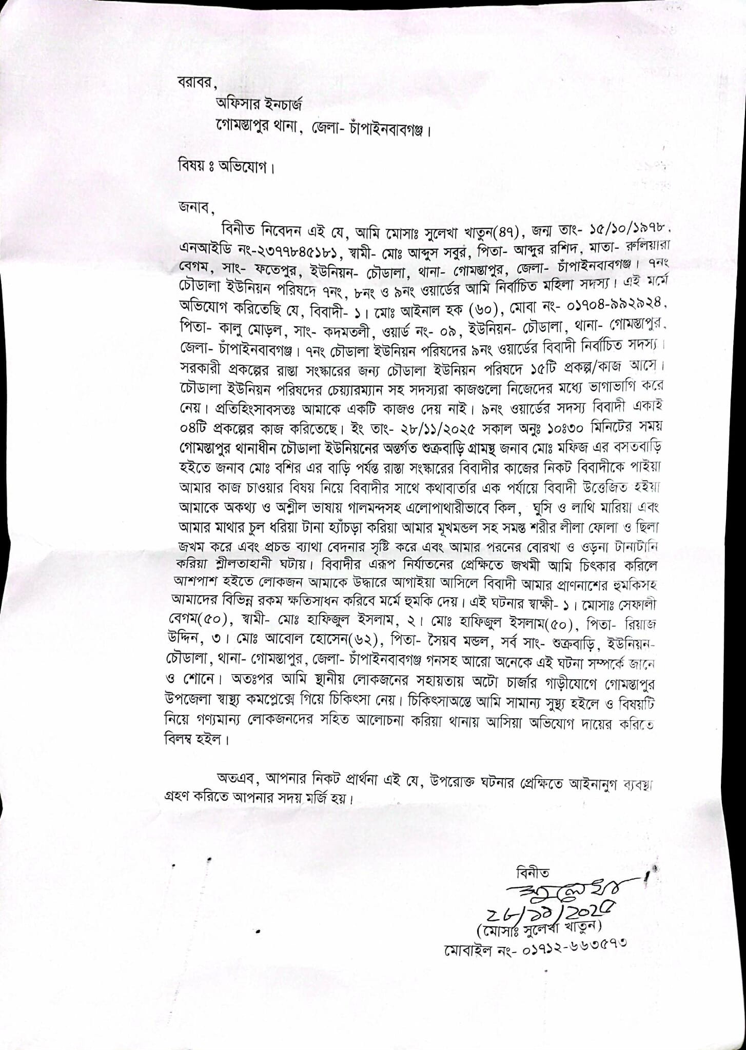 চাঁপাইনবাবগঞ্জের গোমস্তাপুর উপজেলার চৌডালা ইউনিয়ন পরিষদের নারী সদস্য মোসাঃ সুলেখা খাতুন (৪৭)–এর ওপর হামলা, মারধর ও শ্লীলতাহানির অভিযোগ উঠেছে ৯নং ওয়ার্ডের সদস্য মোঃ আইনাল হকের বিরুদ্ধে। এ ঘটনায় ভুক্তভোগী নারী সদস্য গোমস্তাপুর থানায় একটি লিখিত অভিযোগ দায়ের করেছেন।
