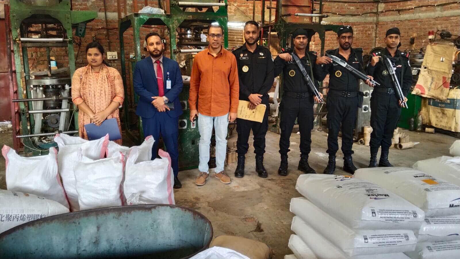 র্যাব প্রতিষ্ঠার পর থেকেই দেশের আইন-শৃঙ্খলা পরিস্থিতি সমুন্নত রাখার লক্ষ্যে সব ধরনের অপরাধীকে আইনের আওতায় নিয়ে আসার ক্ষেত্রে অগ্রণী ভূমিকা পালনসহ মোবাইল কোর্ট পরিচালনা, নিষিদ্ধ ঘোষিত অবৈধ মালামাল উৎপাদনসহ মারাত্মক সব সামাজিক অপরাধের বিরুদ্ধে নিয়মিত অভিযান পরিচালনা করে আসছে। সাম্প্রতিক সময়ে দিনাজপুর জেলায় বিভিন্ন ব্যবসা প্রতিষ্ঠান ও অসাধু ব্যবসায়ীরা নিষিদ্ধ ঘোষিত পরিবেশের জন্য মারাত্মক ক্ষতিকারক প্লাস্টিকের পলিথিন অভিনব কৌশল অবলম্বন করে মজুদ করছে মর্মে তথ্য পাওয়া যায়। তথ্য ভিত্তিতে অবৈধ পলিথিন ব্যবসায়ীদের আইনের আওতায় আনা ও প্রসার রোধে র্যাব-১৩ গোয়েন্দা কার্যক্রম বৃদ্ধি করে। এরই ধারাবাহিকতায় ইং ২৫/১১/২০২৫ তারিখ বিকাল ৩. টার সময় র্যাব-১৩, সিপিসি-১, দিনাজপুরের চৌকস আভিযানিক দল এবং জেলা প্রশাসনের বিজ্ঞ এক্সিকিউটিভ ম্যাজিস্ট্রেট ও পরিবেশ অধিদপ্তরের প্রতিনিধিগণের নেতৃত্বে দিনাজপুর জেলার বিরামপুর থানাধীন বিরামপুর বাজার এলাকায় যৌথ মোবাইল কোর্ট পরিচালনা করে বাংলাদেশ পরিবেশ সংরক্ষন আইন ১৯৯৫ এর ৬ক, ১৫(১), ৪(ক), ৪(খ) ধারামূলে নিষিদ্ধ ঘোষিত অবৈধ পলিথিন উৎপাদন, মজুদ এবং প্রদর্শনে জড়িত ০১ (এক) ব্যক্তিকে ২৫,০০০/- পঁচিশ হাজার টাকা জরিমানা, ৩১৯ কেজি পলিথিন ও পলিথিন তৈরির কাঁচামাল ৯২৩ কেজি পিপি গ্র্যানিউল জব্দ এবং উক্ত প্রতিষ্ঠানকে সিলাগালা করা হয়। একই জেলাধীন হাকিমপুর থানার ডাঙ্গাপাড়া বাজারে অবস্থিত মেসার্স ভাই ভাই প্লাস্টিক কারখানায় অপর ০১ টি মোবাইল কোর্ট পরিচালনা করে পরিবেশ অধিদপ্তরের ছাড়পত্র গ্রহণ না করে অবৈধ প্লাস্টিক কারখানা পরিচালনা করায় উক্ত প্রতিষ্ঠানকে সিলগালা করা হয়। প্রাথমিকভাবে জানা যায় যে, দীর্ঘদিন ধরে অসাধু ব্যবসায়ীগণ অত্যন্ত সুকৌশলে নিষিদ্ধ ঘোষিত অবৈধ পলিথিন উৎপাদন, মজুদ এবং অবৈধ ও ছাড়পত্রবিহীন প্লাস্টিক কারখানা পরিচালনা করাসহ এই জাতীয় অবৈধ ব্যবসা করে আসছিলো।