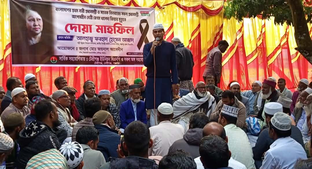 তিনবারের সফল প্রধানমন্ত্রী বেগম খালেদা জিয়ার মৃত্যুতে গভীর শোক প্রকাশ করে টেপ্রিগঞ্জ ইউনিয়নের বাসিন্দা জয়নাল আবেদীন , তার নিজ গোয়ালের গরু জবাই করে জাতীয়তাবাদী দলের আপোষহীন চেয়ারপারসন দেশ নেত্রী ও তিন বারের সফল প্রধানমন্ত্রী বেগম খালেদা জিয়ার মৃত্যুতে দোয়া মাহফিল ও তার আত্মার মাগফিরাত কামনা অনুষ্ঠিত হয়েছে। সেইসাথে প্রায় একাধিক বিভিন্ন দলের নেতাকর্মী প্রধানমন্ত্রী বেগম খালেদা জিয়া,কে শ্রদ্ধা জানিয়ে বিএনপিতে যোগদান করেন। এই দোয়া মাহফিলে এলাকার প্রায় হাজারো বিএনপির নেতাকর্মী সহ সর্বস্তরের মানুষের উপস্থিতি ছিল চোখে পড়ার মতো।এসময় প্রধান অতিথি হিসেবে উপস্থিত থেকে বক্তব্য রাখেন ধানের শীষ প্রতীকের পঞ্চগড় ২ আসনের এমপি প্রার্থী বিএনপির কেন্দ্রীয় কমিটি পল্লী উন্নয়ন বিষয়ক সম্পাদক আলহাজ্ব ফরহাদ হোসেন আজাদ। দোয়া মাহফিটিতে সভাপতিত্ব করেন টেপ্রিগঞ্জ ৫ নাং ওয়ার্ডের আয়োজক বিএনপিতে যোগদানকারী জয়নাল আবেদীন প্রমুখ।