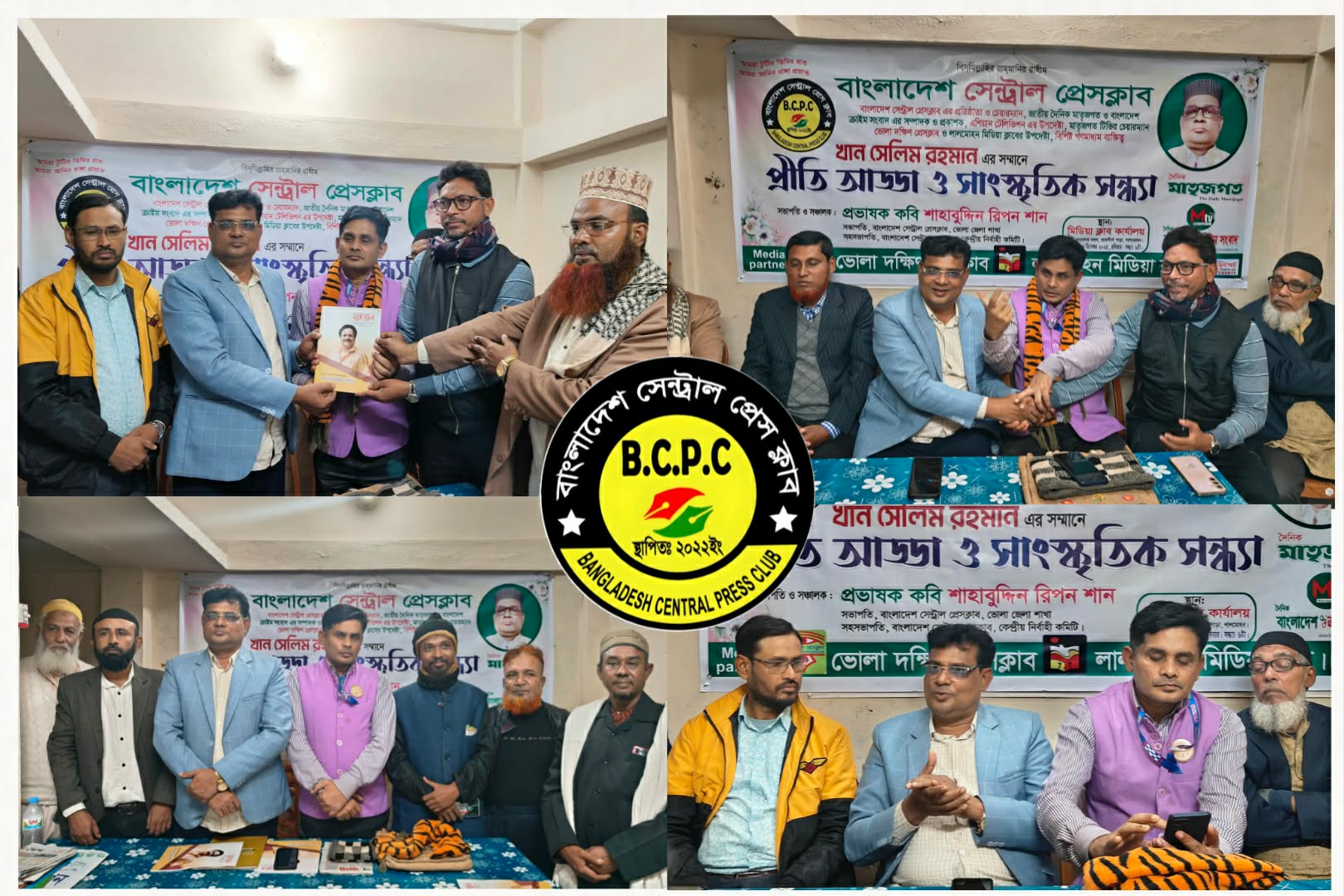 নিজস্ব প্রতিবেদক:- নদীমাতৃক ভোলার গণমাধ্যম কর্মীদের প্রাণের সংগঠন ভোলা দক্ষিণ প্রেসক্লাবের উদ্যোগে বাংলাদেশ সেন্ট্রাল প্রেস ক্লাব (B.C.P.C) প্রতিষ্ঠাতা ও চেয়ারম্যান, জাতীয় দৈনিক মাতৃজগত ও বাংলাদেশ ক্রাইম সংবাদ পত্রিকার সম্পাদক ও প্রকাশক, মাতৃজগত টিভির চেয়ারম্যান, বিশিষ্ট গণমাধ্যম ব্যক্তিত্ব ও নাট্যশিল্পী খান সেলিম রহমানকে নিয়ে এক প্রীতি আড্ডা ও সাংস্কৃতিক সন্ধ্যার আয়োজন করা হয়।