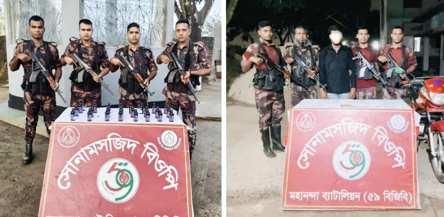 চাঁপাইনবাবগঞ্জ মহানন্দা ব্যাটালিয়ন (৫৯ বিজিবি) কর্তৃক সোনামসজিদ বিওপির ১টি বিশেষ দল পৃথক ২ টি অভিযানে বিপুল পরিমাণে মাদকসহ ১ জনকে আটক করেছে। বর্তমানে বিজিবি মহাপরিচালক মহোদয় এবং সকল পর্যায়ের ঊর্ধ্বতন কর্তৃপক্ষের নির্দেশনা মোতাবেক সীমান্ত দিয়ে মাদক চোরাচালান প্রতিরোধে প্রতিটি বিজিবি সদস্য সজাগ ও তৎপর রয়েছে। এরই ধারাবাহিকতায় অদ্য ০৫ নভেম্বর ২০২৫ তারিখ মধ্যরাত আনুমানিক ১ টা ঘটিকায় অত্র ব্যাটালিয়নের অধীনস্থ সোনামসজিদ বিওপির একটি বিশেষ টহল দল সীমান্ত পিলার ১৮৪/৪-এস হতে আনুমানিক দুই কিঃমিঃ বাংলাদেশের অভ্যন্তরে চাঁপাইনবাবগঞ্জ জেলার শিবগঞ্জ থানাধীন শাহাবাজপুর ইউনিয়নের মুসলিমপুর গ্রামে অভিযান পরিচালনা করে। উক্ত অভিযানে টহল দল মালিকবিহীন ২৫ বোতল ভারতীয় ফেন্সিডিল আটক করতে সক্ষম হয়। এছাড়াও অপর অভিযানে অদ্য ০৫ নভেম্বর ২০২৫ তারিখ সন্ধ্যা আনুমানিক ৬ ঘটিকায় একই বিওপি হতে একটি বিশেষ টহলদল সীমান্ত পিলার ১৮৪/৪-এস হতে আনুমানিক চার কিলোমিটার বাংলাদেশের অভ্যন্তরে চাঁপাইনবাবগঞ্জ জেলার শিবগঞ্জ থানাধীন মোবারকপুর ইউনিয়নের লাহাপুর গ্রামস্থ সরকারী প্রাথমিক বিদ্যালয় হতে একশত গজ পশ্চিমে পাকা রাস্তার উপর অভিযান পরিচালনা করে। উক্ত অভিযানে টহলদল একজন চোরাকারবারী আটক করেছে বিজিবি। আটককৃত আসামী হচ্ছে শিবগঞ্জ উপজেলার চরদৌলতপুর গ্রামে মৃত গাউস উদ্দিনের ছেলে মোঃ রুবেল হোসেন (৩৯)। আসামীর কাছ থেকে জব্দকৃত ১০৭ পিস ভারতীয় ইয়াবা এবং ০১টি মোটরসাইকেলসহ (HERO HF- DELUXE 100 CC) আটক করতে সক্ষম হয়েছে বিজিবি। অন্যদিকে আটককৃত ফেন্সিডিল জিডি করতঃ ইতোমধ্যে শিবগঞ্জ থানায় জমা করা হয়েছে এবং ইয়াবাসহ আসামী মামলা করতঃ শিবগঞ্জ থানায় হস্তান্তরের কার্যক্রম চলমান রয়েছে।