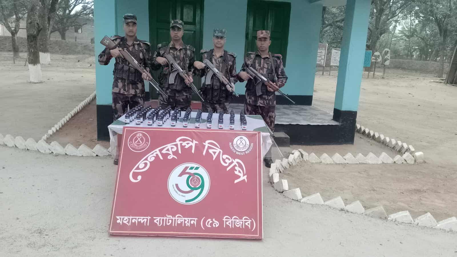 গত ১৯ ডিসেম্বর গভীর রাত থেকে ২০ ডিসেম্বর ২০২৫ তারিখ সকাল পর্যন্ত ৫৯ বিজিবির অধীন সোনামসজিদ ও তেলকুপি বিওপি তাদের নিজ নিজ দায়িত্বপূর্ণ এলাকায় সীমান্তের শূন্য রেখা হতে আনুমানিক ৩০ থেকে ৫০ গজের মধ্যে পৃথক অভিযান পরিচালনা করে। অভিযানে প্লাস্টিকের বস্তায় অভিনব কায়দায় মোড়কজাত অবস্থায় ফেন্সিডিলের বিকল্প হিসেবে ব্যবহৃত ১৩৮ বোতল ভারতীয় CHOCO+ সিরাপ এবং ৪৮ বোতল ভারতীয় নেশাজাতীয় Eskuf DX সিরাপসহ মোট ১৮৬ বোতল নেশাজাতীয় সিরাপ জব্দ করা হয়।