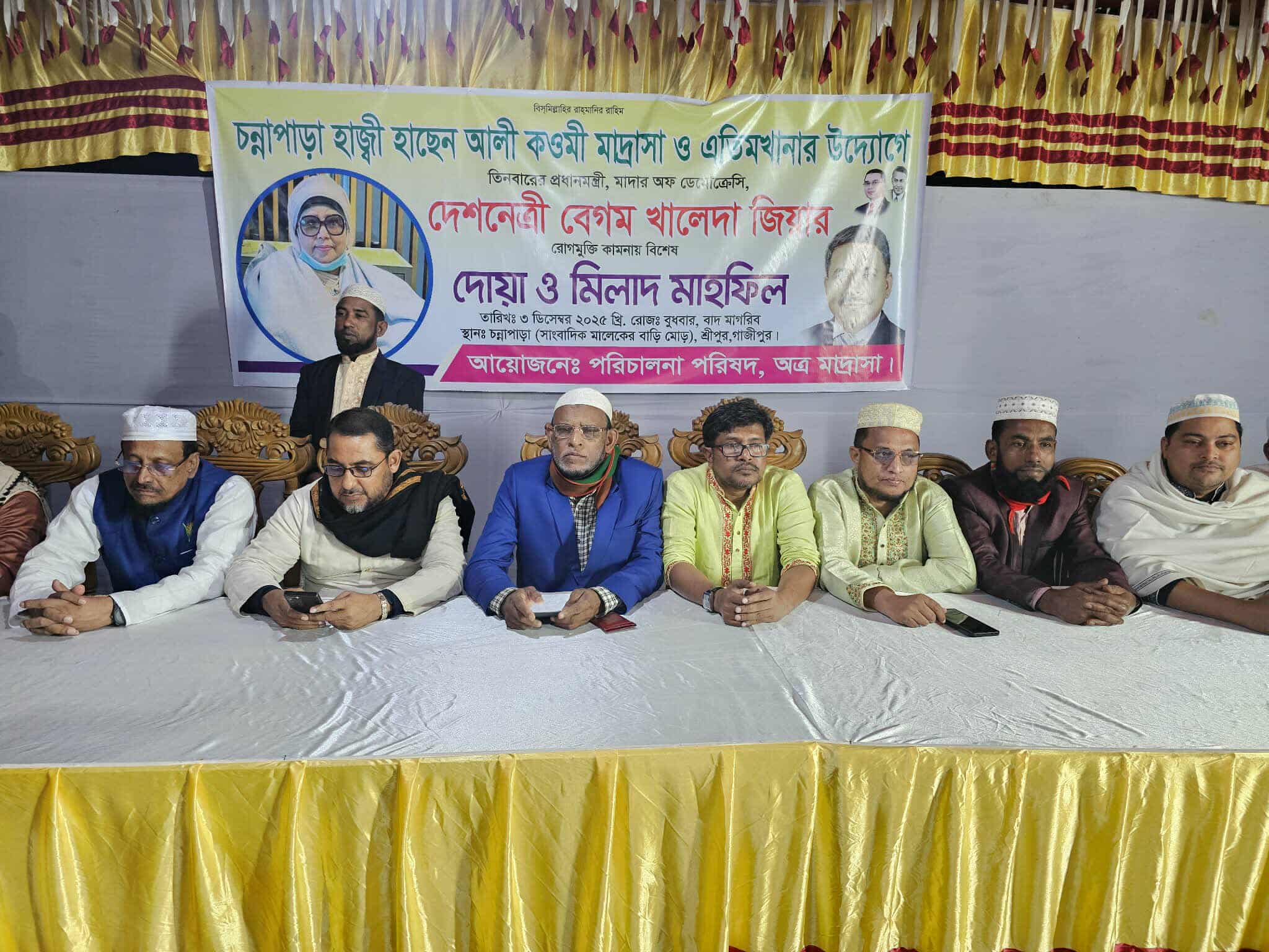 গাজীপুরের শ্রীপুরে চন্নাপাড়া হাজ্বী হাছেন আলী কওমী মাদরাসা ও এতিমখানার উদ্যোগে তিন বারের সাবেক প্রধানমন্ত্রী দেশনেত্রী বেগম খালেদা জিয়ার রোগমুক্তি কামনায় কুরআন খতম, বিশেষ দোয়া ও মিলাদ মাহফিল অনুষ্ঠিত হয়েছে।