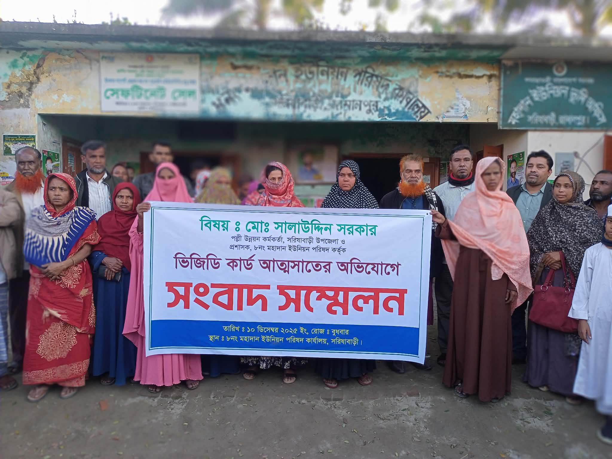 জামালপুরের সরিষাবাড়ী উপজেলার মহাদান ইউনিয়নে ভিডব্লিউবি কর্মসূচির জন্য উপকারভোগী মহিলা নির্বাচনের চূড়ান্ত তালিকার কার্ড ও চাল আত্মসাতের অভিযোগে ইউপি প্রশাসক সালাউদ্দিন সরকারের বিরুদ্ধে বিক্ষোভ ও সাংবাদিক সম্মেলন করেছেন বঞ্চিত ভুক্তভোগীরা। মঙ্গলবার (১০ ডিসেম্বর) বিকেলে উপজেলার মহাদান ইউনিয়ন পরিষদের সামনে বিক্ষুব্ধরা এসব কর্মসূচি পালন করেছেন।