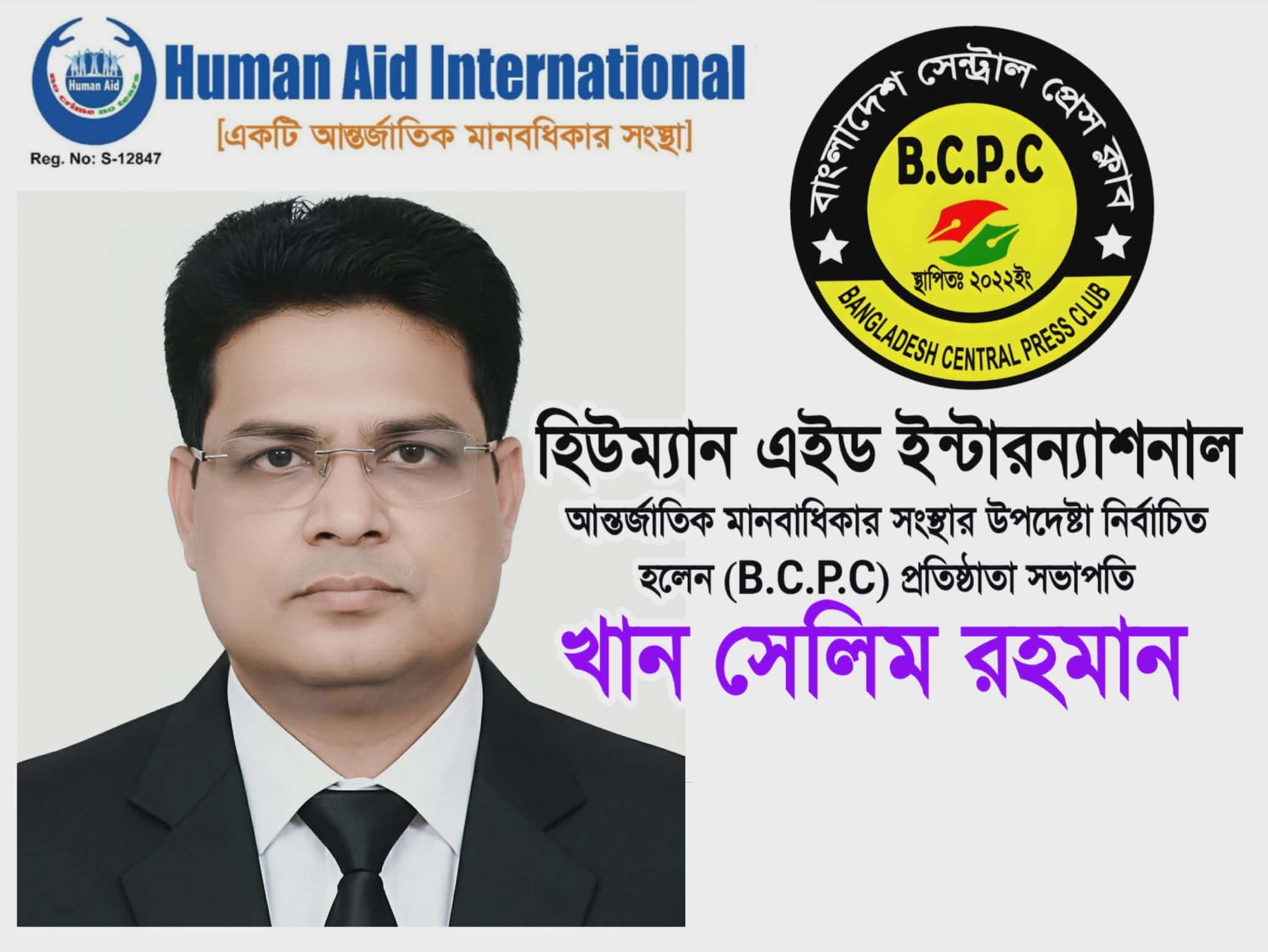 নিজস্ব প্রতিবেদক : বাংলাদেশ সেন্ট্রাল প্রেস ক্লাব (B.C.P.C)-এর প্রতিষ্ঠাতা সভাপতি, জাতীয় দৈনিক মাতৃজগত পত্রিকার সম্পাদক, বিশিষ্ট সাংবাদিক ও মানবাধিকার কর্মী খান সেলিম রহমান আন্তর্জাতিক মানবাধিকার সংস্থা হিউম্যান এইড ইন্টারন্যাশনালের উপদেষ্টা পরিষদের স্থায়ী সদস্য হিসেবে নির্বাচিত হয়েছেন। তাঁর এ নির্বাচনে দেশের মানবাধিকার অঙ্গন, সাংবাদিক সমাজ ও সুশীল মহলে ব্যাপক সন্তোষ ও আশাবাদ ব্যক্ত করা হয়েছে।