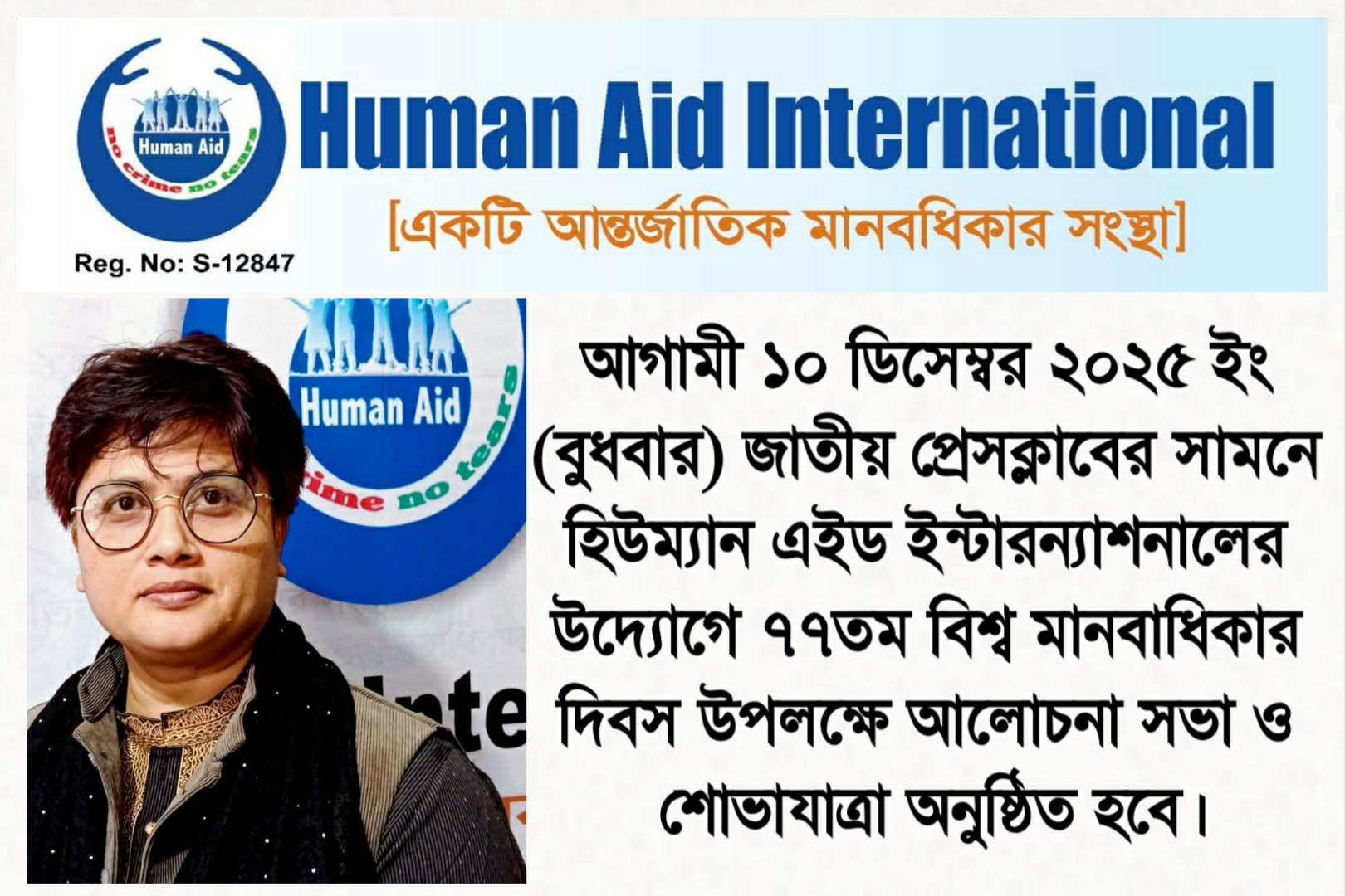 নিজস্ব প্রতিবেদক:- আগামী ১০ ডিসেম্বর ২০২৫ (বুধবার) জাতীয় প্রেসক্লাবের সামনে হিউম্যান এইড ইন্টারন্যাশনালের উদ্যোগে ৭৭তম বিশ্ব মানবাধিকার দিবস উপলক্ষে আলোচনা সভা ও শোভাযাত্রা অনুষ্ঠিত হবে।