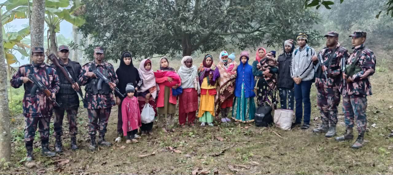 চাঁপাইনবাবগঞ্জ জেলার মহানন্দা ব্যাটালিয়ন (৫৯ বিজিবি) অধীনস্থ ভোলাহাট সীমান্ত দিয়ে ভারত থেকে অবৈধভাবে বাংলাদেশে অনুপ্রবেশের দায়ে ২৭ জন ব্যক্তিকে আটক করা হয়েছে। গতকাল (২২ ডিসেম্বর) ভোররাত আনুমানিক ০৪.০০ ঘটিকার সময় মহানন্দা ব্যাটালিয়নের (৫৯ বিজিবি) অধীনস্থ চাঁপাইনবাবগঞ্জ জেলাধীন ভোলাহাট উপজেলার সীমান্ত এলাকা দিয়ে ২৭ জন (পুরুষ-০৮, নারী-১২, শিশু-০৫, তৃতীয় লিঙ্গ-০২) ব্যক্তি পাসপোর্ট ব্যতীত অবৈধভাবে বাংলাদেশে অনুপ্রবেশের চেষ্টাকালে বিজিবি কর্তৃক আটক হয়। উক্ত ব্যক্তিবর্গ বিভিন্ন সময় পাসপোর্ট বিহীন সীমান্ত অতিক্রম করে ভারতে গমন করেছিল। পরবর্তীতে পাসপোর্ট ব্যতীত তারা বাংলাদেশে অনুপ্রবেশের চেষ্টাকালে আন্তর্জাতিক সীমান্তে বিজিবি কর্তৃক গ্রেফতার হয়। বর্তমানে তাদের ঠিকানা, জাতীয় পরিচয়পত্র এবং বাংলাদেশী নাগরিকত্বসহ বিভিন্ন বিষয় নিশ্চিত করার লক্ষ্যে জিডির মাধ্যমে থানায় হস্তান্তর প্রক্রিয়াধীন!