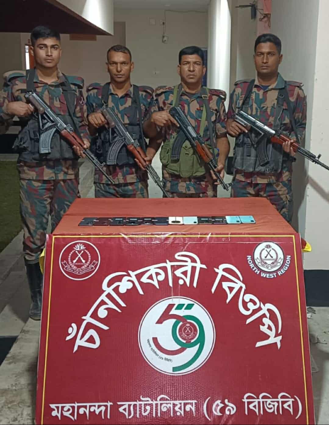বিজিবি মহাপরিচালক মহোদয় এবং সকল পর্যায়ের ঊর্ধ্বতন কর্তৃপক্ষের নির্দেশনা ও অভিপ্রায় অনুযায়ী মহানন্দা ব্যাটালিয়ন (৫৯ বিজিবি) এর সদস্যরা সীমান্তে চোরাচালান দমনসহ যে কোন অপতৎপরতার বিরুদ্ধে সর্বদা সজাগ রয়েছে এবং প্রতিনিয়ত আভিযানিক কর্মকান্ডে সফলতা প্রদর্শন করে চলেছে। বিজিবি সদস্যদের কর্তব্যনিষ্ঠা ও পেশাদারিত্বের ধারাবাহিকতায় গতকার (৮ নভেম্বর) রাত আনুমানিক ১০ টায় অত্র ব্যাটালিয়নের অধীনস্থ চাঁনশিকারী বিওপি’র ০১টি বিশেষ টহল দল বিওপি’র দায়িত্বপূর্ণ এলাকার সীমান্ত পিলার ১৯৬/২-এস হতে আনুমানিক ২০০ গজ বাংলাদেশের অভ্যন্তরে চাঁপাইনবাবগঞ্জ জেলার ভোলাহাট থানাধীন ১নং ভোলাহাট ইউনিয়নের চামুচা গ্রামের গড়ের মাঠ নামক স্থানে অভিযান পরিচালনা করে মালিকবিহীন ১২টি ভারতীয় বিভিন্ন মডেলের ব্যবহৃত চোরাই মোবাইল ফোন আটক করতে সক্ষম হয়েছে। আটককৃত মোবাইলফোনগুলো প্রচলিত নিয়ম অনুযায়ী কাস্টমসে জমা করার কার্যক্রম চলমান রয়েছে।