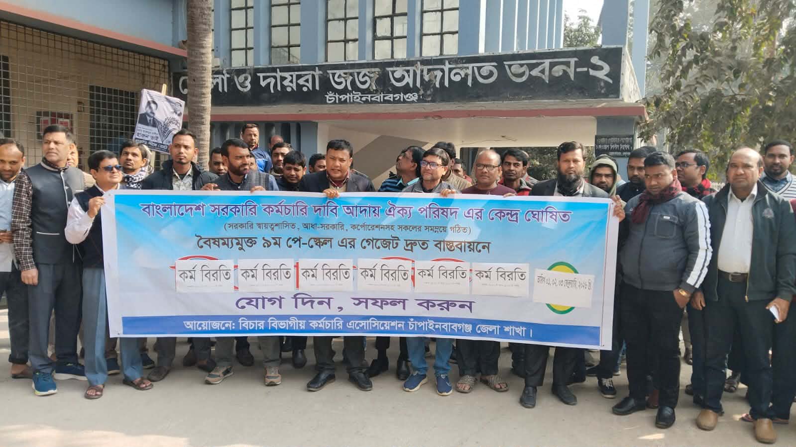 বাংলাদেশ সরকারি কর্মচারী দাবি আদায় ঐক্য পরিষদের কেন্দ্রীয় কর্মসূচির অংশ হিসেবে সরকারি স্বায়ত্তশাসিত, আধা-সরকারি ও কর্পোরেশনসহ সকল কর্মচারীর সমন্বয়ে গঠিত বৈষম্যমুক্ত ৯ম পে-স্কেল এর গেজেট দ্রুত বাস্তবায়নের দাবিতে কর্মবিরতি পালন করেছে চাঁপাইনবাবগঞ্জ জেলা শাখার বিচার বিভাগীয় কর্মচারী এসোসিয়েশন।