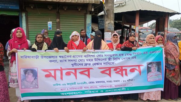সরিষাবাড়ীতে র্যাব সদস্যের স্ত্রী লিপি হত্যার বিচারের দাবিতে উত্তাল রাজপথমানববন্ধন শেষে থানায় অবস্থান কর্মসূচি