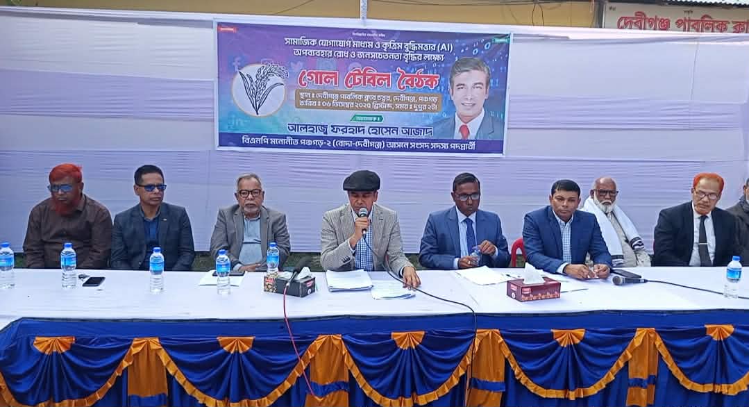 দেবীগঞ্জ উপজেলার বিভিন্ন পেশাজীবিদের সুচিন্তিত মতামত ও পরামর্শের জন্য গোলটেবিল বৈঠকে গণমাধ্যমকর্মী, শিক্ষক, আইনজীবী, ইমাম, পুরোহিত, ব্যবসায়ী, সমাজসেবক, চিকিৎসক সহ বিভিন্ন পেশার মানুষ অংশ নেন। বৈঠক চলাকালে তারা বিভিন্ন মতামত প্রদান করেন। সামাজিক যোগাযোগ মাধ্যম ও কৃত্রিম বুদ্ধিমত্তার অপব্যবহার রোধে গোল টেবিল বৈঠকে জাতীয়তাবাদী দল বিএনপির কেন্দ্রীয় নির্বাহী সংসদের পল্লী উন্নয়ন বিষয়ক সম্পাদক, বাংলাদেশ জাতীয় ফুটবল ফেডারেশন গভর্নমেন্ট রিলেশন কমিটির ডেপুটি চেয়ারম্যান ও পঞ্চগড় জেলা বিএনপির সদস্য সচিব ফরহাদ হোসেন আজাদ প্রধান অতিথি হিসেবে উপস্থিত থেকে বক্তব্য দেন।