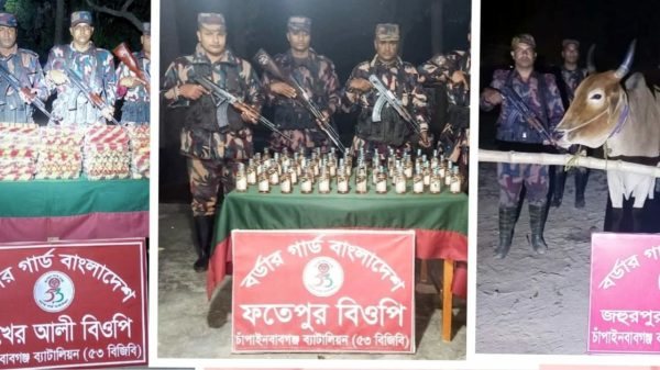 সীমান্তে ৫৩ বিজিবির পৃথক পৃথক অভিযানে ভারতীয় মদ, শাড়ী, চাদর ও ২টি গরু জব্দ