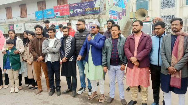 কুলিয়ারচরে হাদি হত্যার প্রতিবাদে বিক্ষোভ মিছিল, দ্রুত বিচার দাবি।