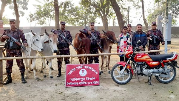সীমান্তে ০২(দুই) জন ভারতীয় গরু চোরাকারবারি ও তাদের (এক) বাংলাদেশী সহযোগীসহ আটক