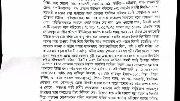 চৌডালা নারী ইউপি সদস্যকে মারধর ও শ্লীলতাহানির অভিযোগ
