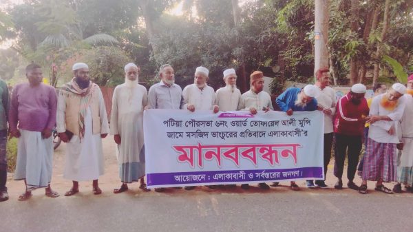 পটিয়ায় মসজিদের ছাদ ও মিম্বর ভাঙচুর, উক্তেজনা সংঘর্ষের আশংকা, প্রতিবাদে এলাকাবাসীর মানববন্ধন